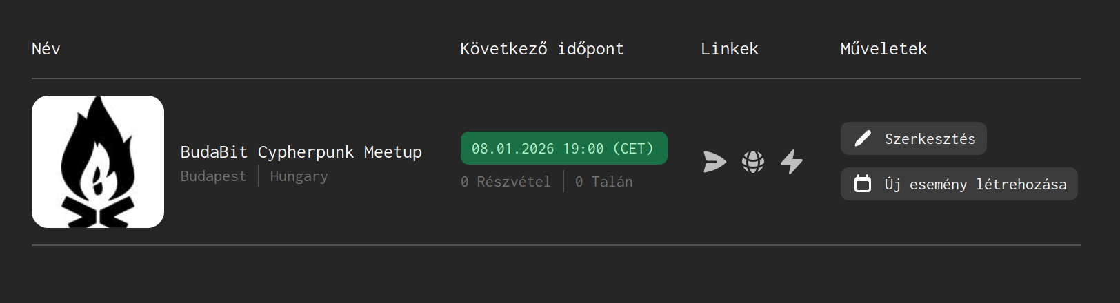 - A 'Meetupok' oldalon a 'Meetup létrehozása' gombbal hozz létre új meetupot. Itt megadhatod a várost/települést, nevet, logót, stb.